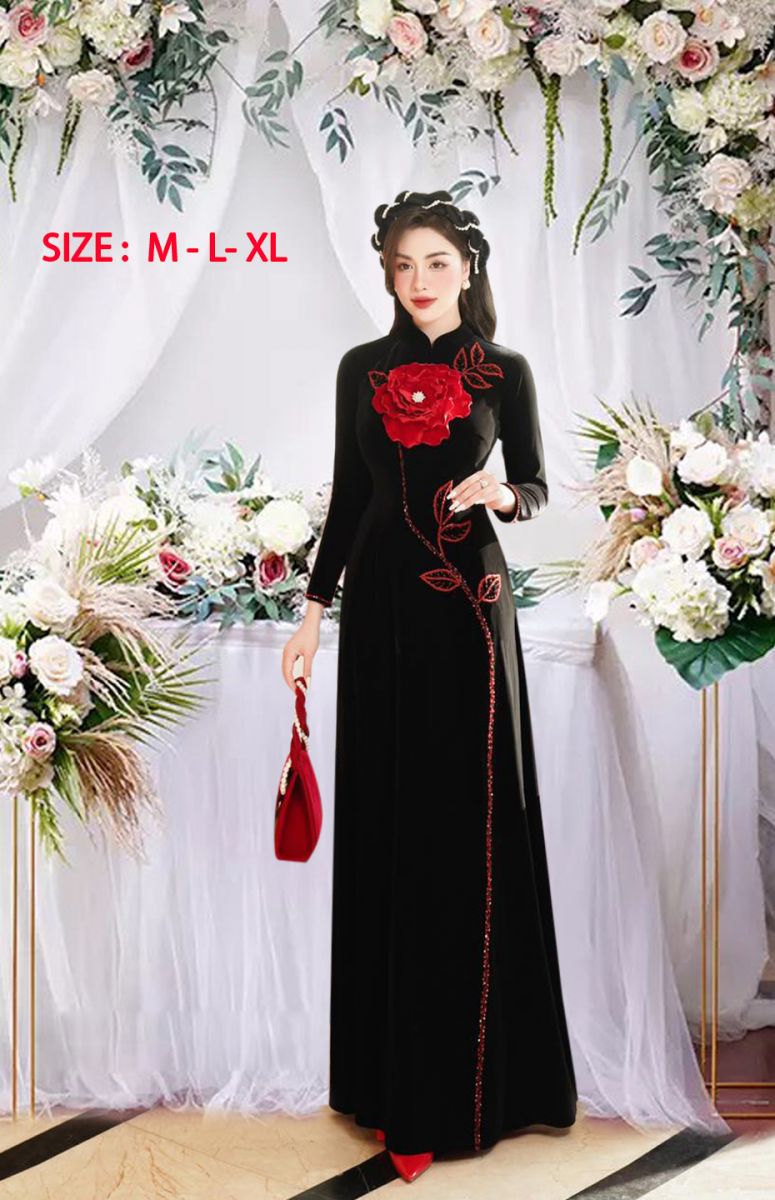 Hãy trải nghiệm cảm giác thần thái và quý phái của áo dài màu đỏ với kết hình bông hoa hồng, mang đến cho bạn vẻ đẹp truyền thống và tinh tế của văn hóa Việt Nam.