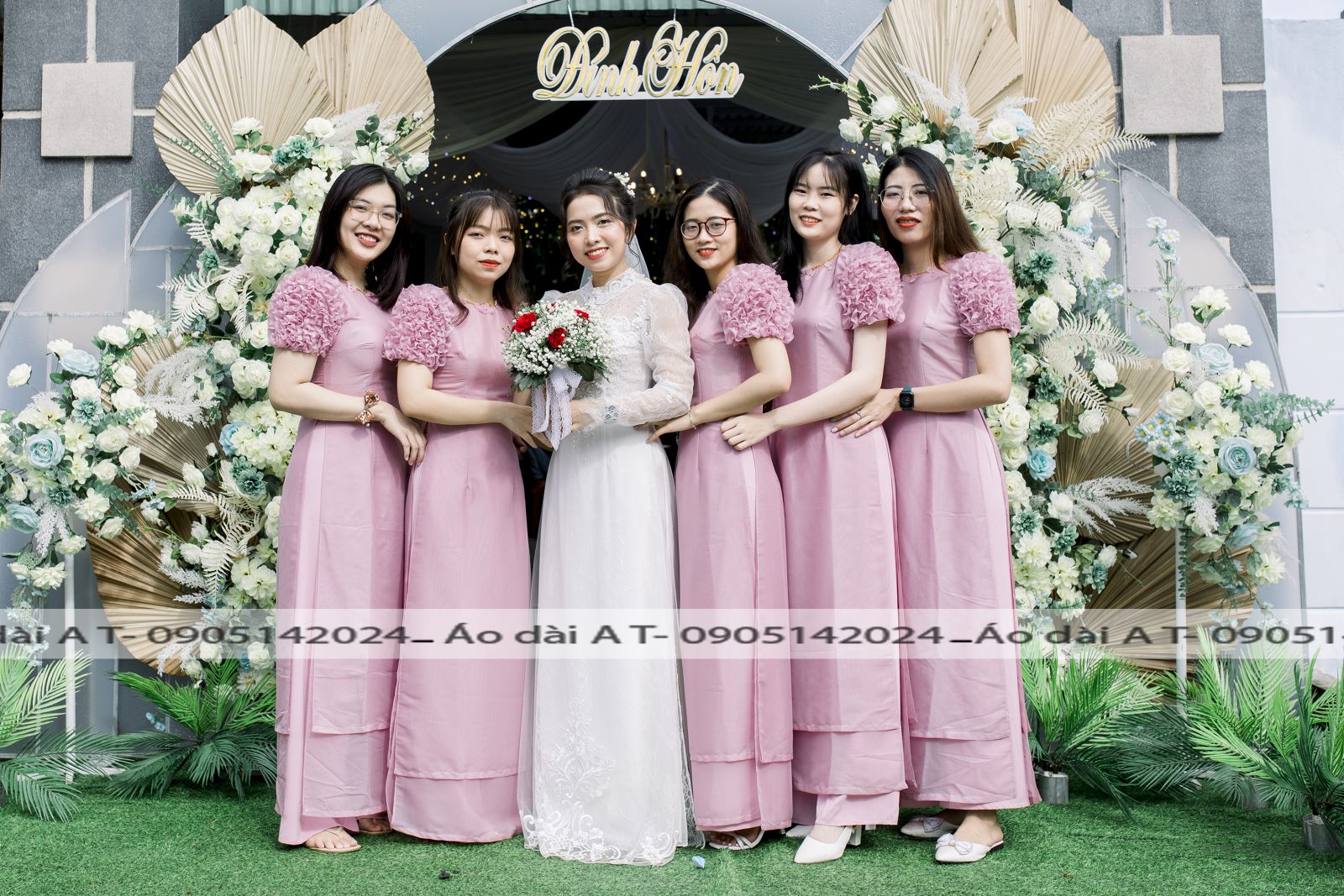 Bên cạnh đó, cũng như mẫu áo dài cưới dành cho cô dâu, áo dài bưng quả của các nàng phù dâu cũng cần được biến hóa để trở nên rực rỡ hơn. Chính vì thế, ở mẫu áo dài này, với họa tiết hoa nhí giúp dàn phụ dâu trở nên trẻ trung, dịu dàng, nữ tính và thanh thoát hơn rất nhiều.