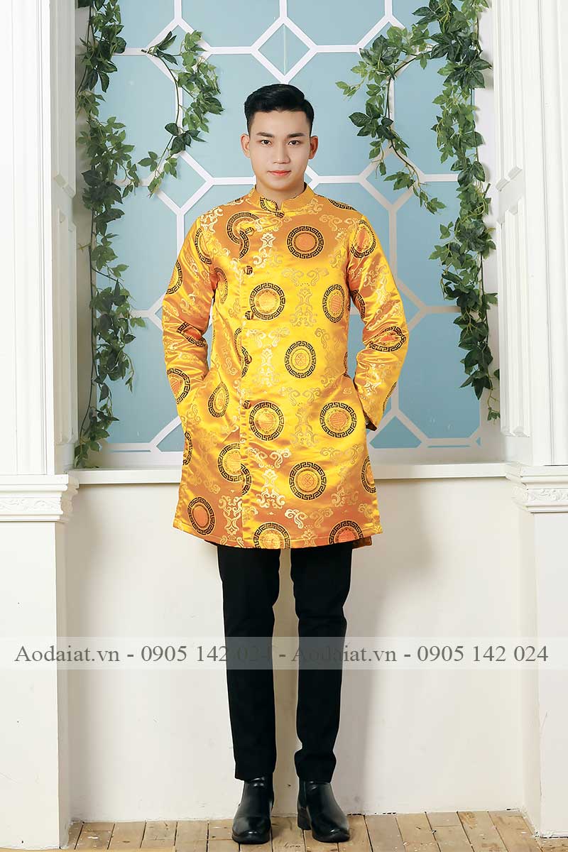 Ngoài ra, các bạn còn thấy được sự kết hợp với chiếc quần màu vàng giúp mang lại sự hài hòa hoặc tương phản đủ để làm bạn nổi bật trong ngày cưới. Đặc biệt, khi cô dâu chú rể cùng nhau mặc đôi áo này mang lại hình ảnh vô cùng ấn tượng và bắt mắt. Bộ áo này chính là sự kết hợp khéo léo, tinh tế tạo nên vẻ đẹp vừa truyền thống, vừa hiện đại mà vô cùng hợp thời với thiết kế cổ trụ và họa tiết thêu tay cầu kì chạy dọc theo tà áo.