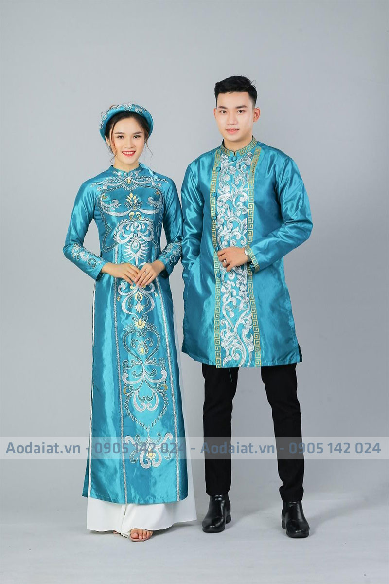 Trong đó, áo dài đám hỏi màu xanh như mẫu áo dài đám hỏi ADH-AT02 của Áo dài AT được ví như một sự ra đời mới mẻ nhưng không hề phá cách.