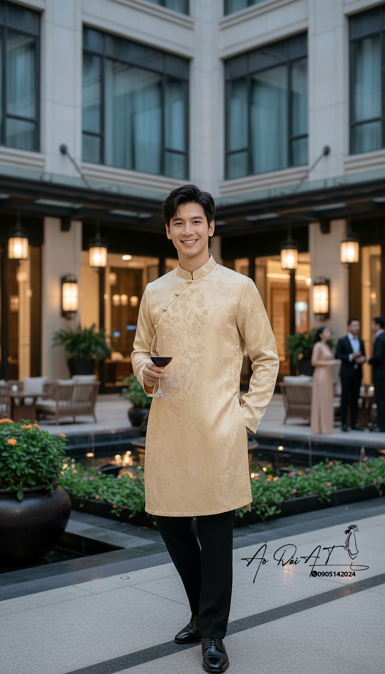 Thiết kế áo dài nam nổi bật với gam vàng champagne ánh nhẹ, mang lại cảm giác sang trọng – lịch lãm – đẳng cấp ngay từ ánh nhìn đầu tiên. Tone màu này đặc biệt dễ phối, tôn da và phù hợp với những dịp quan trọng như lễ cưới, dạm hỏi, sự kiện cao cấp.