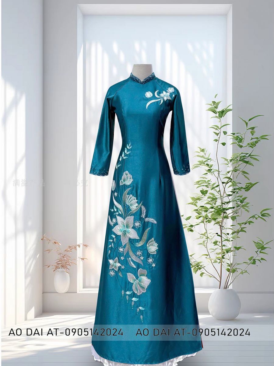Aó dài bigsize màu xanh thêu hoa ép đá cao cấp