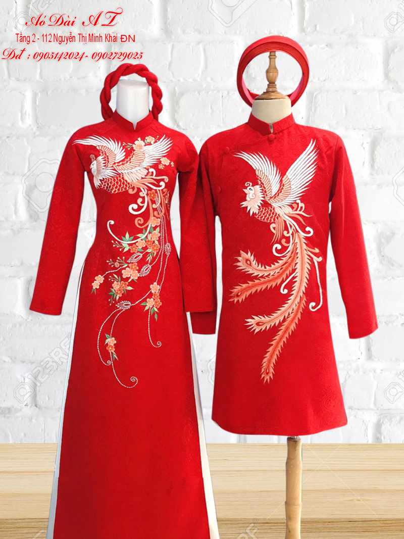 Áo dài cưới đôi đỏ áo dài đôi cưới màu đỏ thêu hình con hạc bay