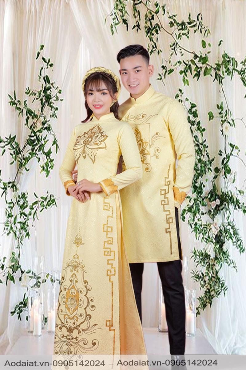 Áo dài đôi vàng với nam chất tacta và nữ lụa vân gỗ